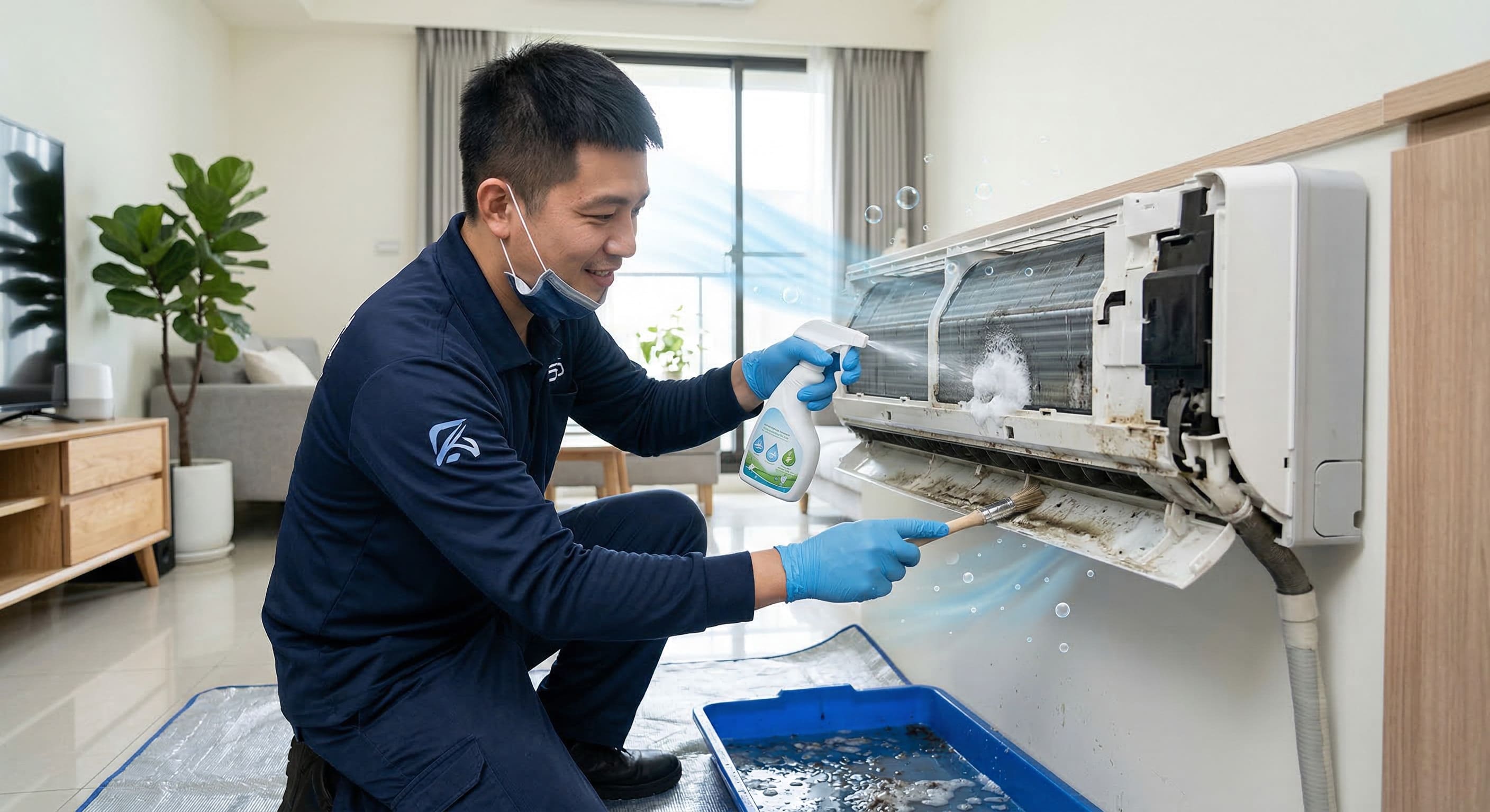 濾網的功能僅限於阻擋大顆粒灰塵,無法阻止水氣與微小黴菌進入機體。酸臭味的真正來源,是深藏在散熱鋁鰭片縫隙與內部貫流風扇上的厚重霉斑及細菌代謝物,單純洗濾網完全無法觸及這些區域。您需要使用專業的台中冷氣清洗劑進行深層發泡去污,將內部髒污徹底沖洗乾淨。清洗乾燥後,務必再噴灑專用的冷氣機除臭劑,從分子層面瓦解殘留的異味根源,才能真正恢復空氣的清新。